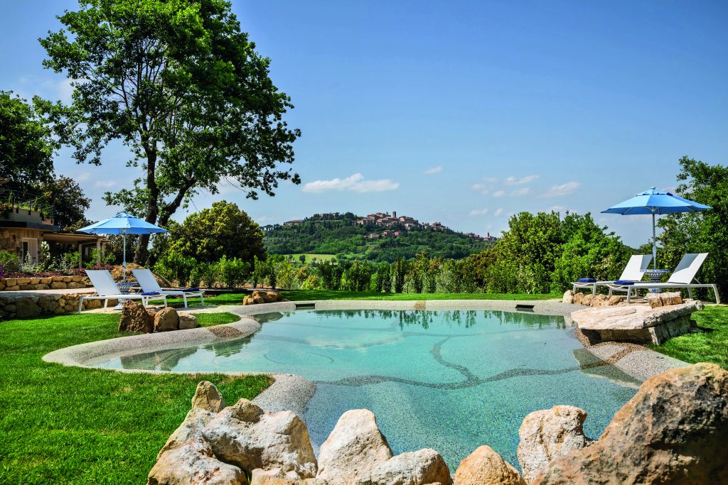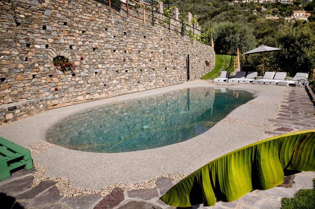 Aunque las piscinas de arena se asocian a formas libres, también pueden tener un diseño más definido: líneas rectas, acceso en escalera continua, zonas delimitadas.