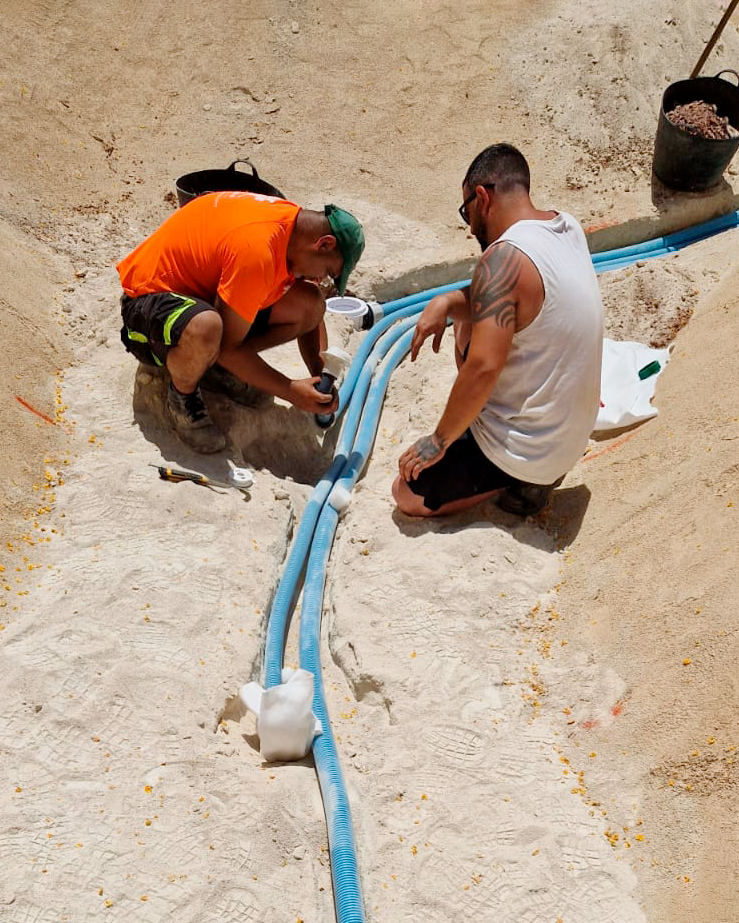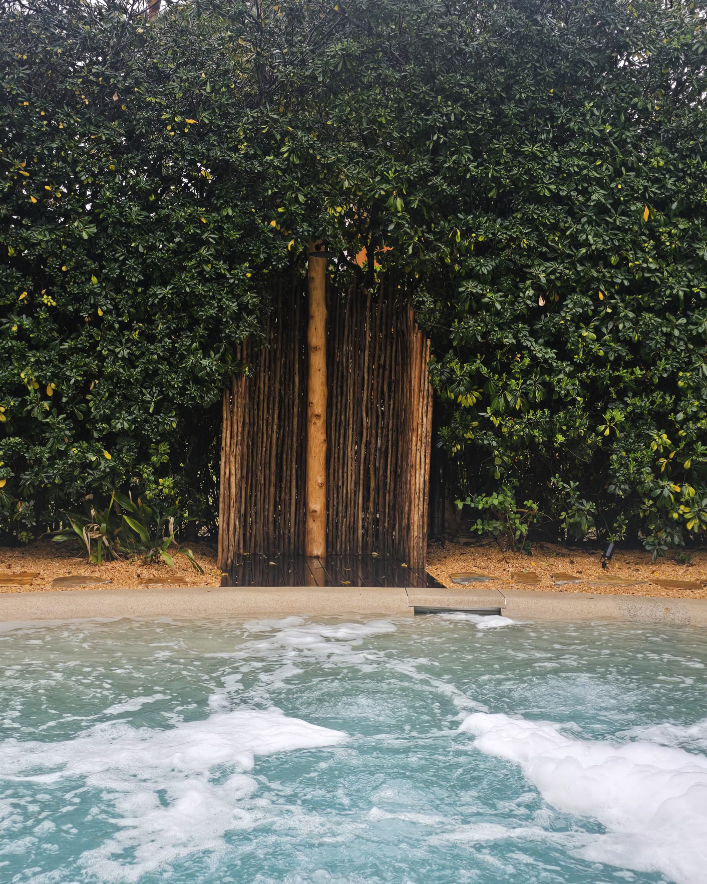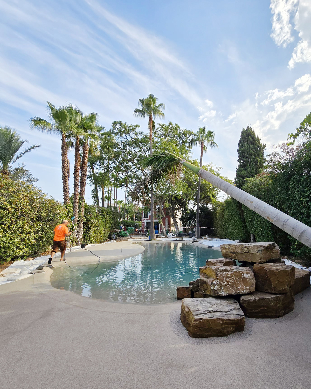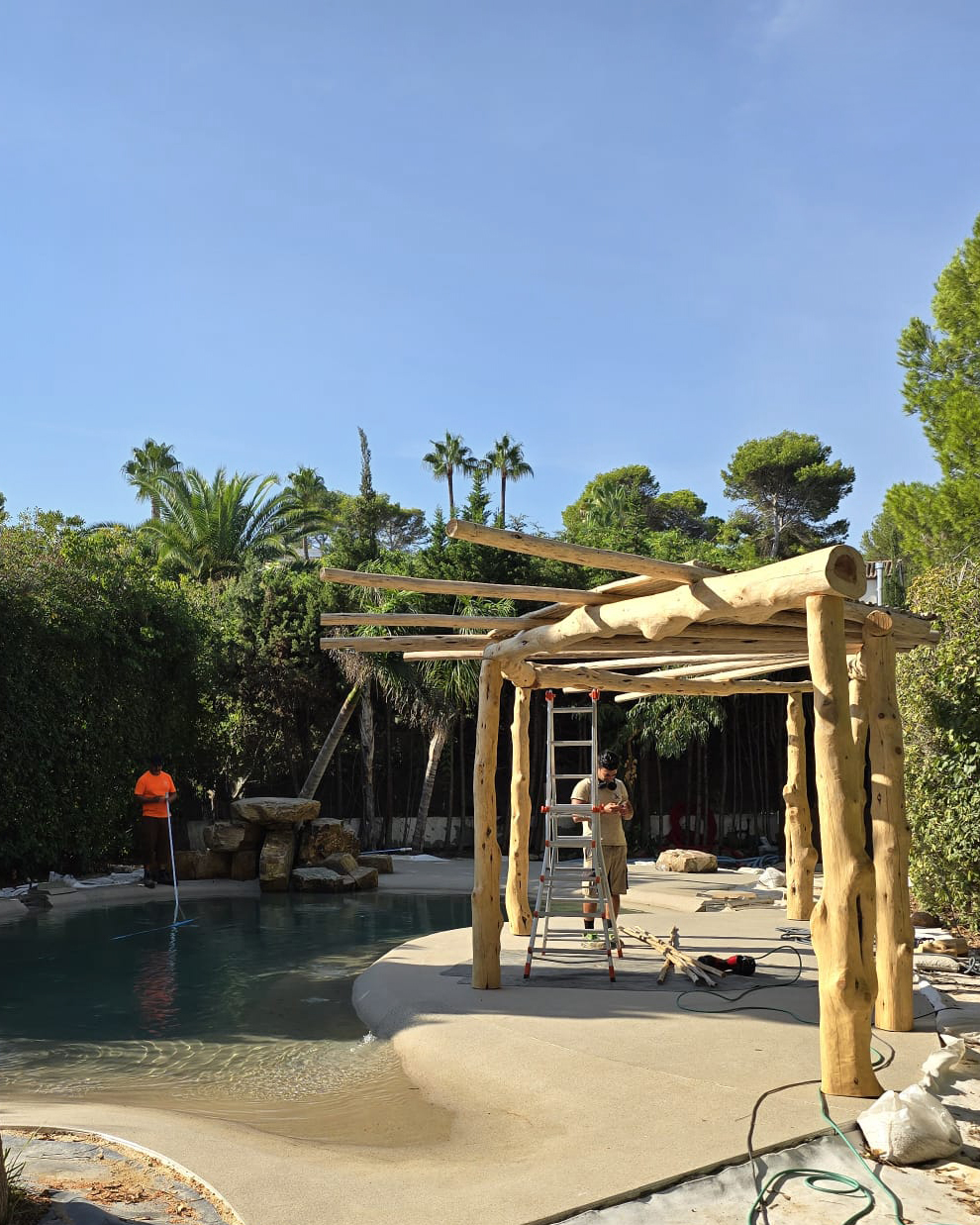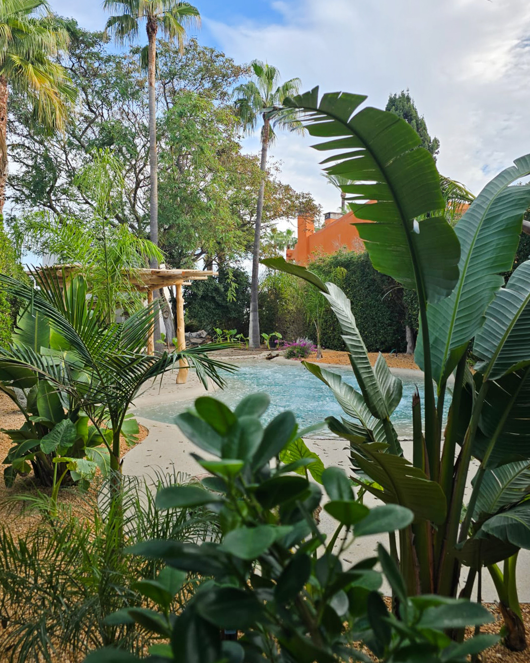 El diseño incluye entrada tipo playa, zona de baño principal, una cascada con rocas naturales y áreas de descanso con pérgolas de madera. También nos encargamos de rediseñar todo el entorno para acompañar la nueva estética, creando una atmósfera tropical y acogedora. Puedes ver el proyecto completo de paisajismo aquí.